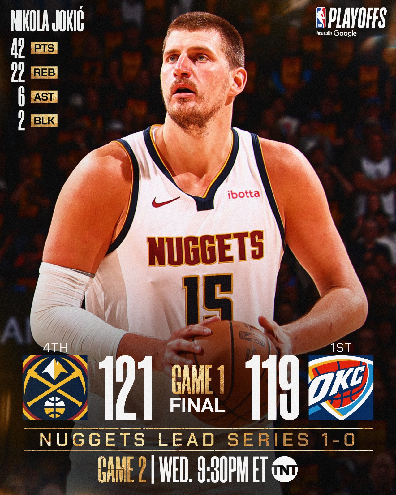 Nikola Jokić just made NBA playoff history! In Game 1 vs. OKC on May 5, 2025, the Joker dropped 42 PTS, 22 REB, 6 AST, and 2 BLK—becoming the 4th player ever to hit 40/20/5 in a postseason game and the 1st with 2+ blocks! Nuggets edge Thunder 121-119.