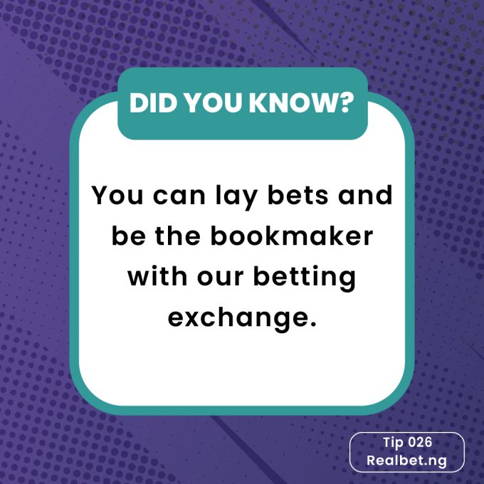 ByRealbetFebruary 2, 2025Hello Real bettors, Did you know you can lay bets on realbet.ng exchange service; giving you total control to act as the bookmaker...